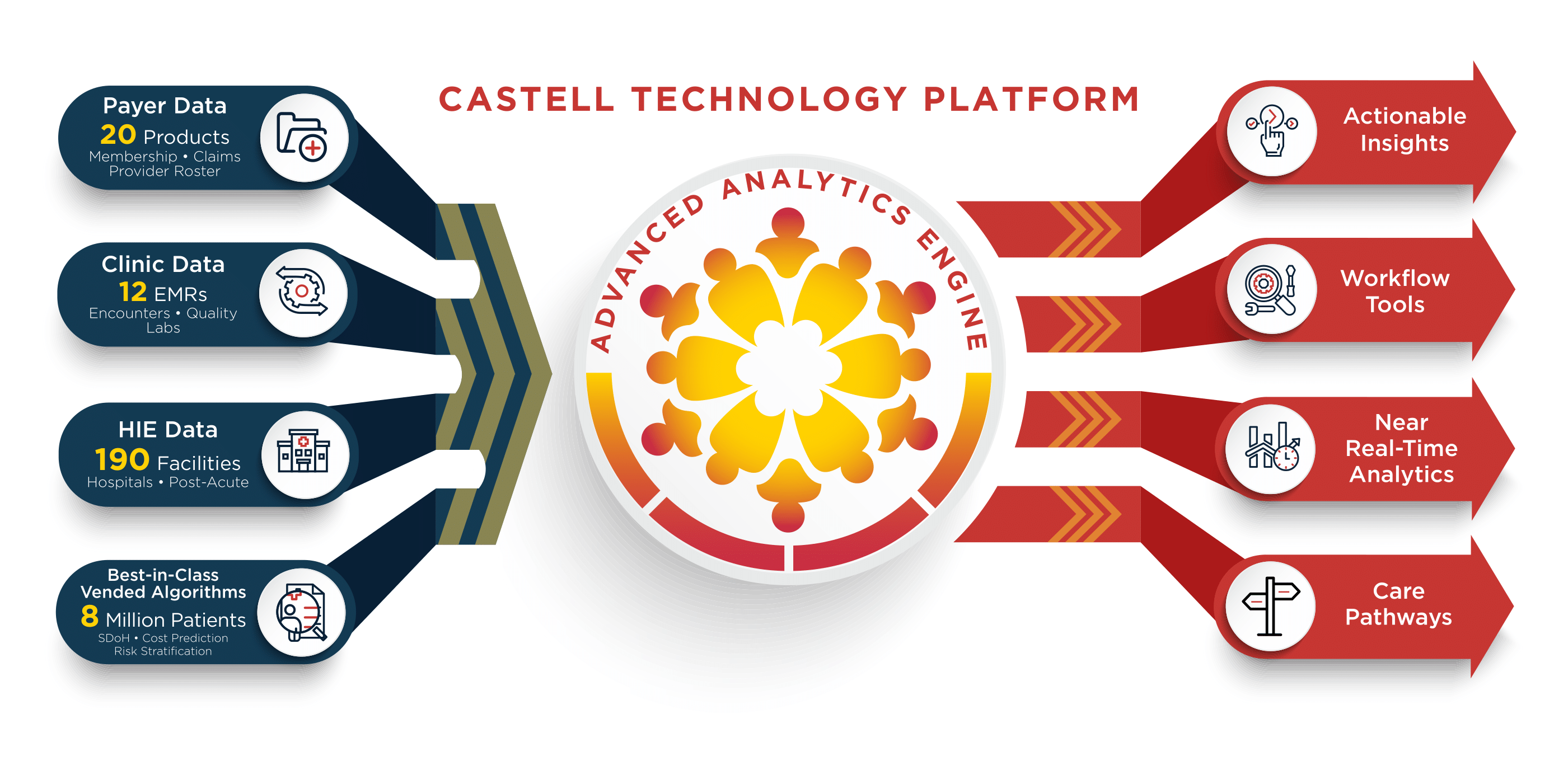 Castell's analytics platform aggregates data from diverse sources across the healthcare continuum. This data is aggregated and enriched with proprietary algorithms and best-in-class vended algorithms to create a comprehensive view of a patient not otherwise visible to the provider.